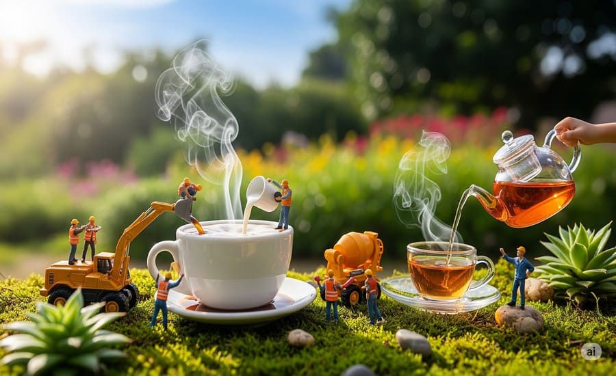 Kleine Miniaturfiguren inszenieren eine Kaffeepause im Grünen.
