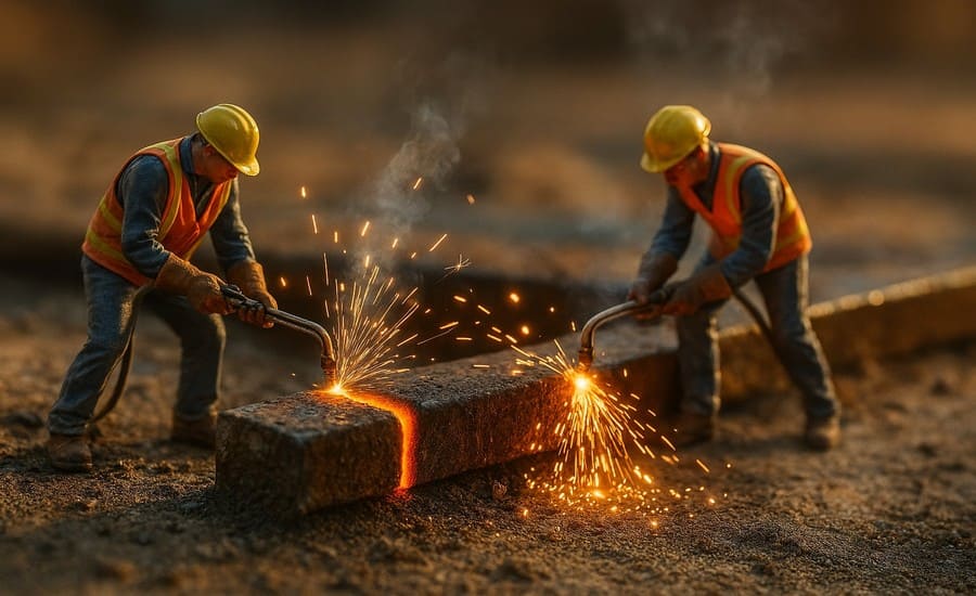 Miniatur-Arbeiter schneiden glühende Stahlträger zu.