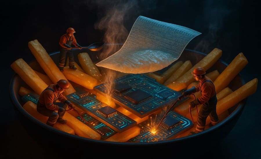 Arbeiter bereiten Fish & Chips auf futuristische Weise zu.
